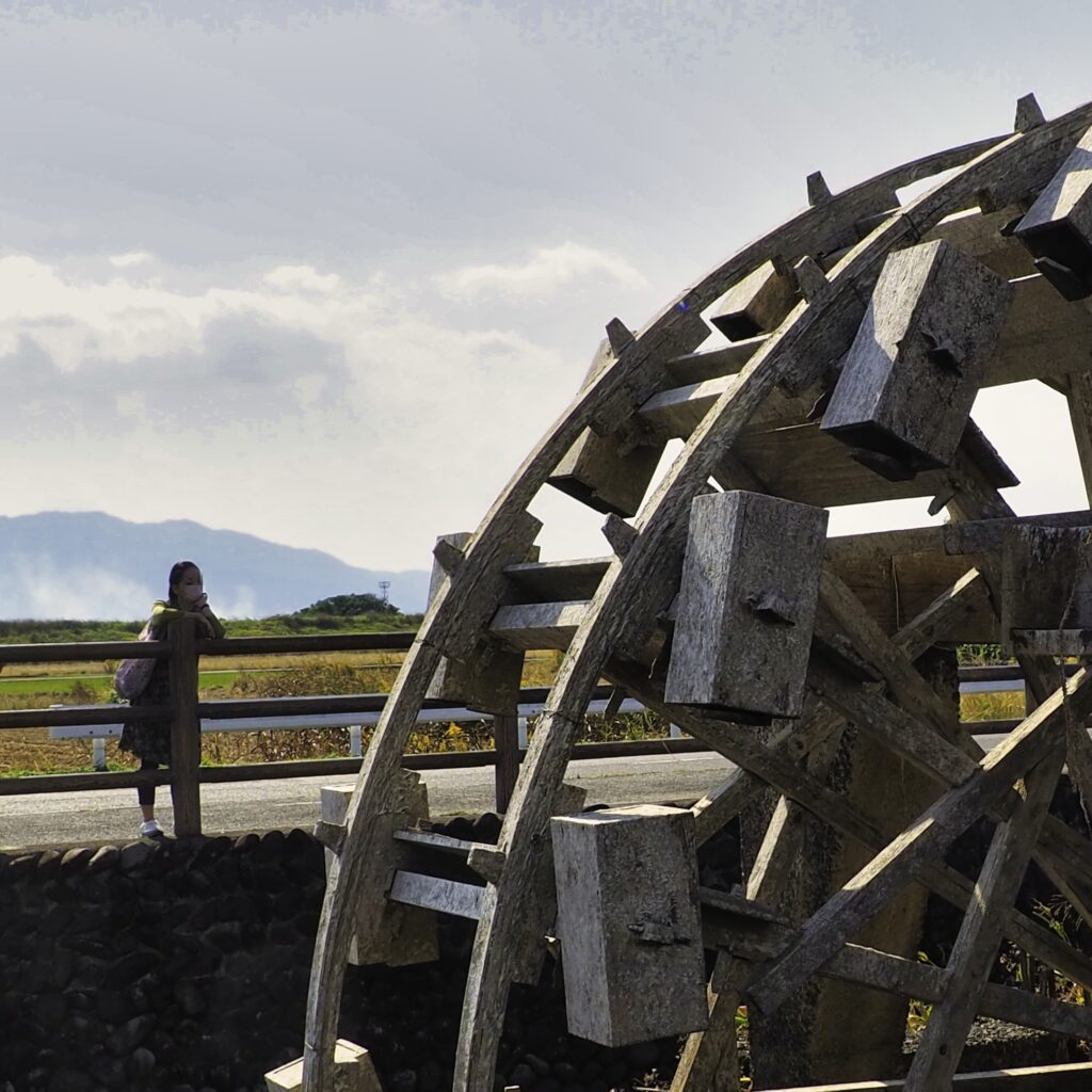 木造の水車が田園の中でゆっくり回る光景は、まるで時間が止まったような静けさ。
