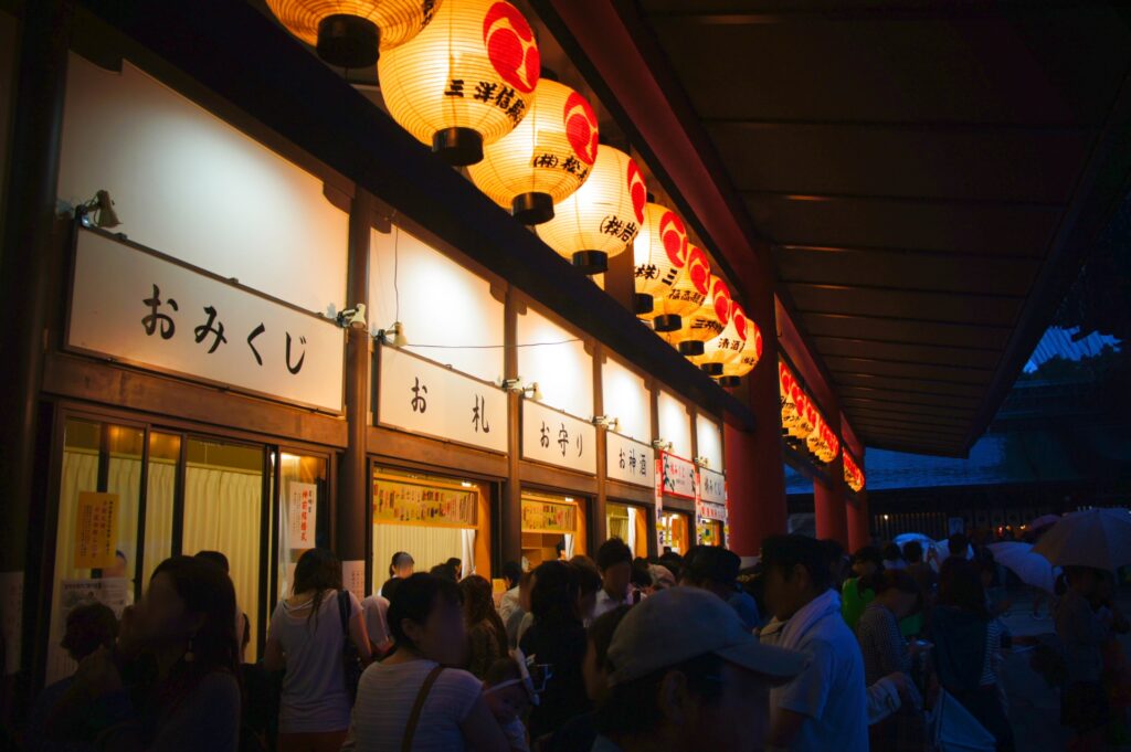 参道に約500の露店が並び、灯りがともる夕景は格別。