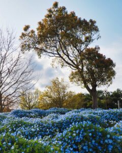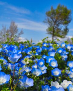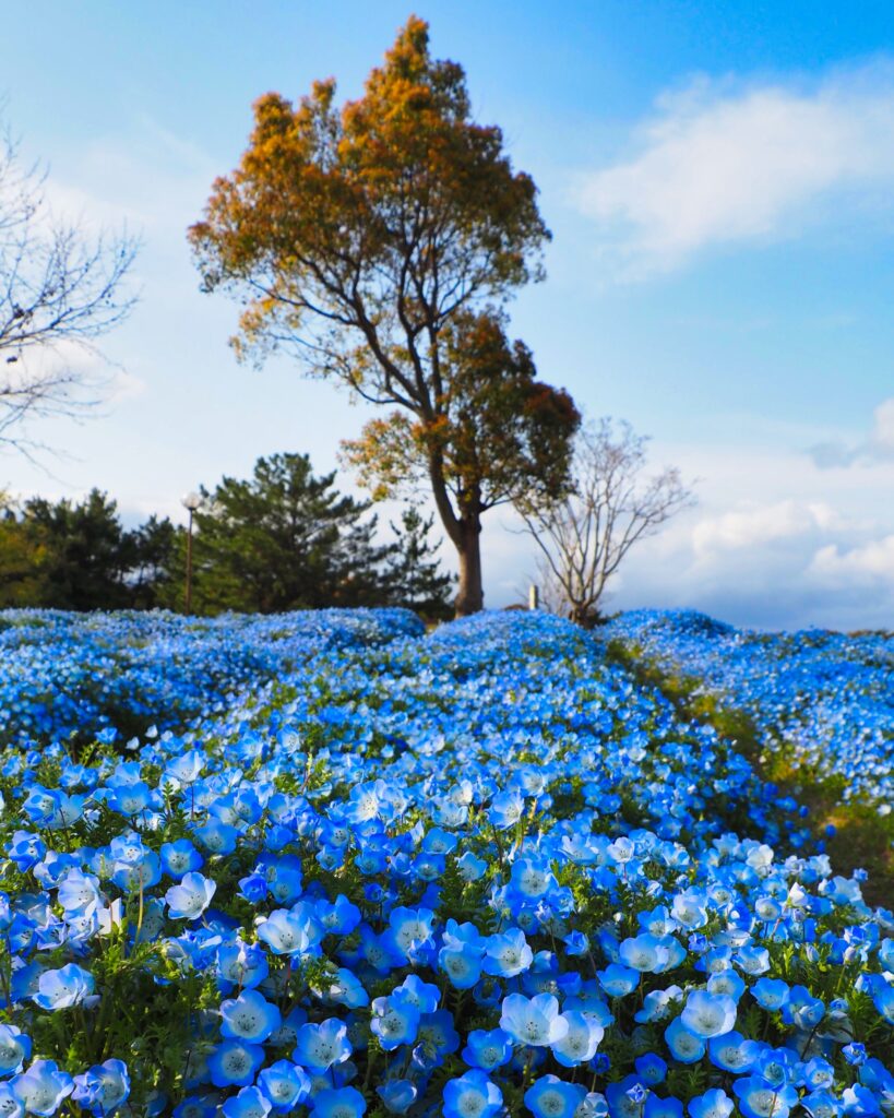 ・ネモフィラの丘の中央に立つ一本の木がフォトスポット。