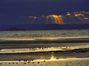 雲間からこぼれる光がカーテンのように海へと差し込み、光と影が幻想的に交錯。