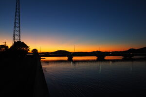 夕方、空が赤く染まりはじめる頃 弁天橋から眺める加布里湾の風景は、まるで映画のワンシーンのような美しさに包まれます。