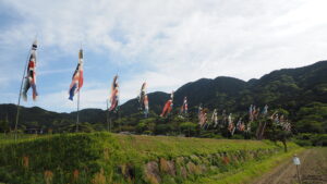 この地は、古代米「赤米」の栽培地としても知られており、赤米の稲穂が揺れる棚田とともに、春には風に舞う鯉のぼりが訪れる人々の心を和ませてくれます。