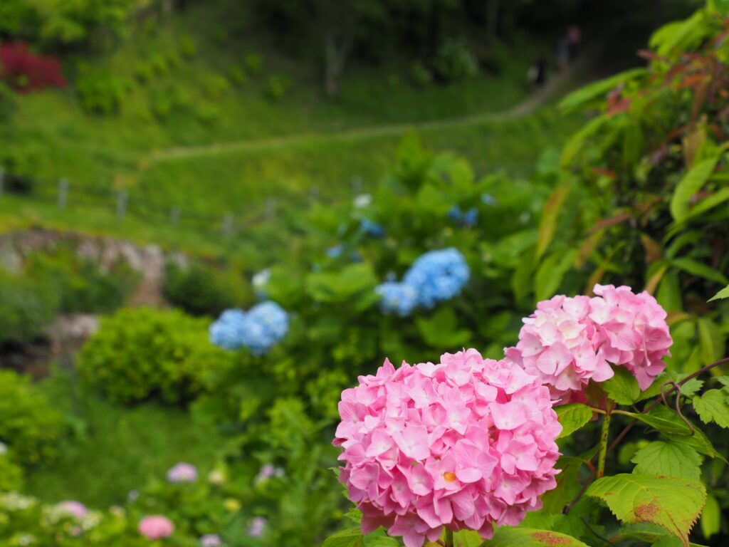 しっとりとした空気に包まれたあじさいの道は、どこか幻想的な雰囲気。